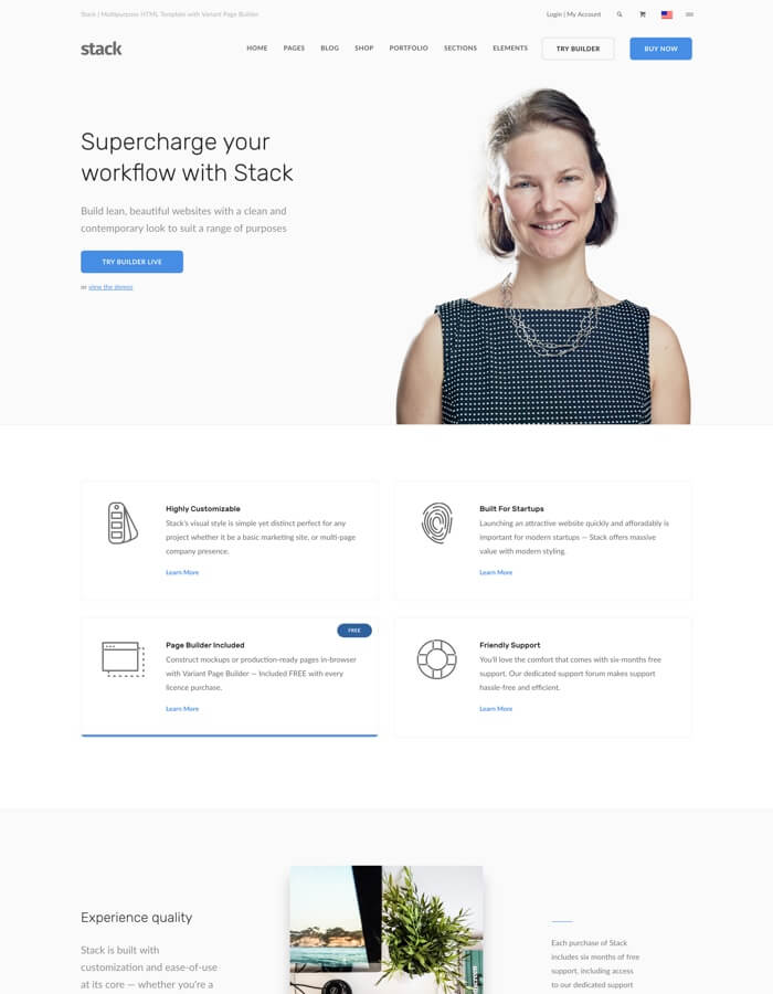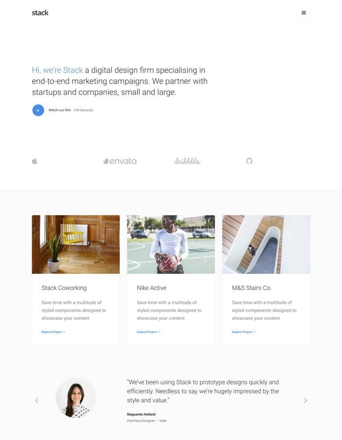 Whether you’re building a welcome mat for your SaaS or a clean, corporate portfolio, Stack has your design and functionality needs covered.