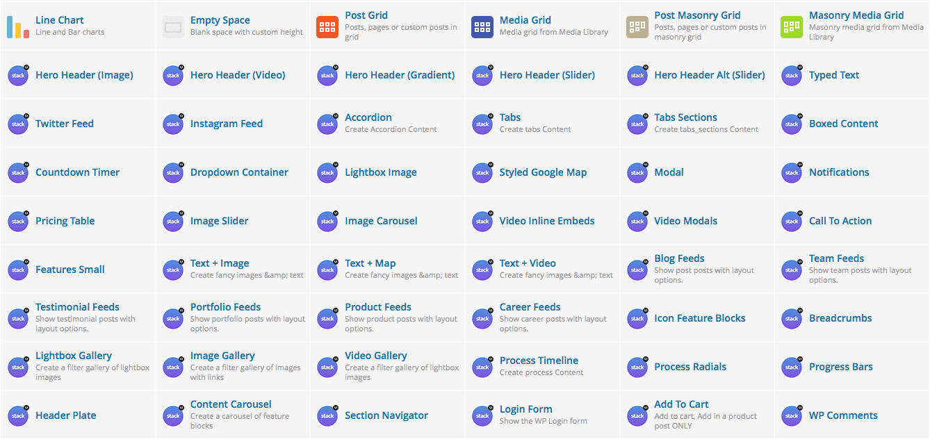 Believe it or not but this list doesn't even show off half of the capabilities of Stack, check out our homepage demos and the blocks section of the site to see everything in action.